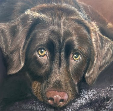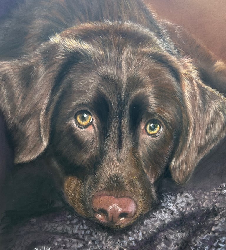One of the portraits I’ve painted for the pub is of a rather handsome chocolate Labrador called Abe. Abe doesn’t actually live here in the UK — he’s an American lad! I first came across his photo on a Facebook page that generously shares free reference photos for artists. The moment I saw his big soulful eyes and that glossy chocolate coat, I just knew he’d make a wonderful subject.