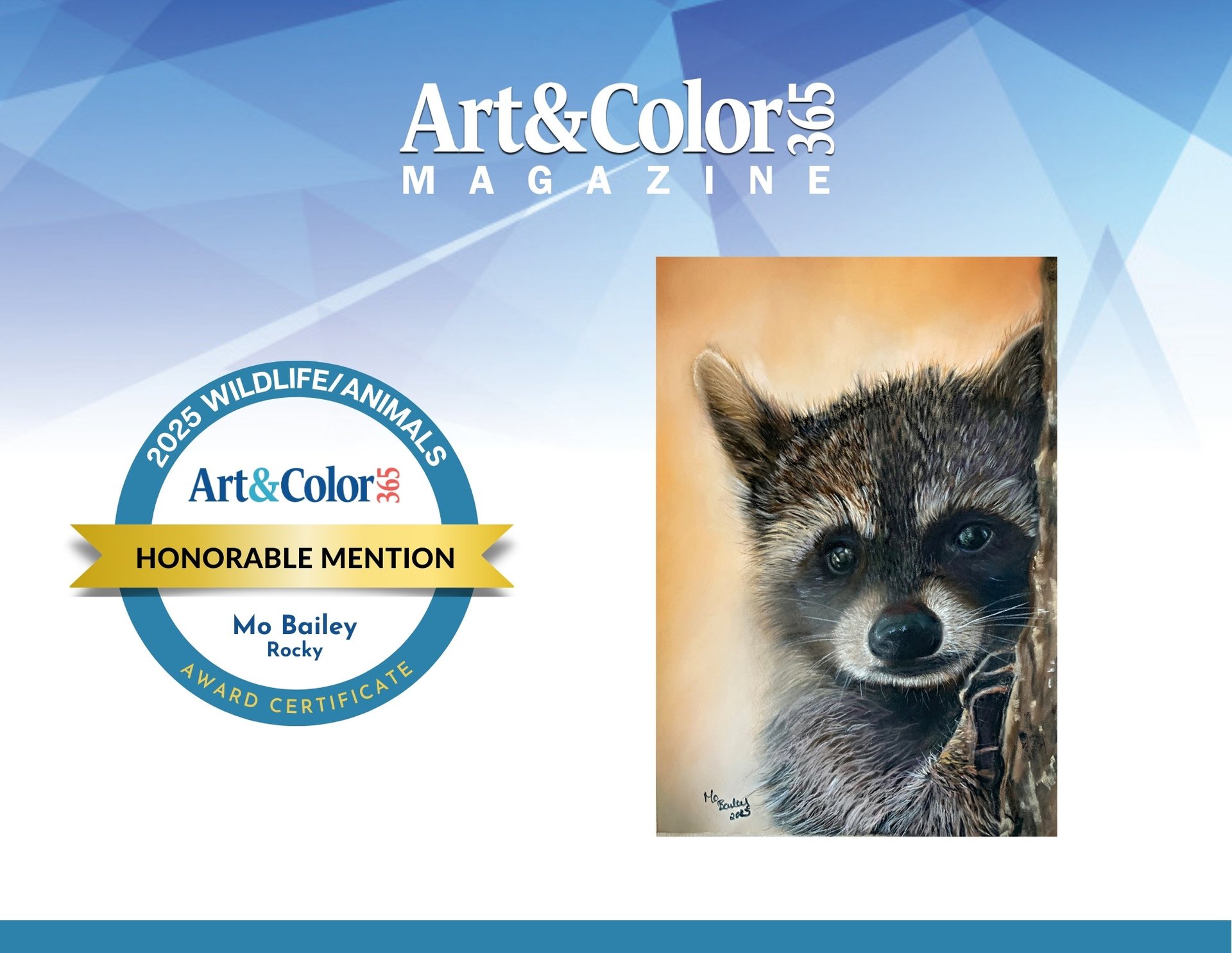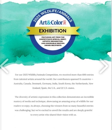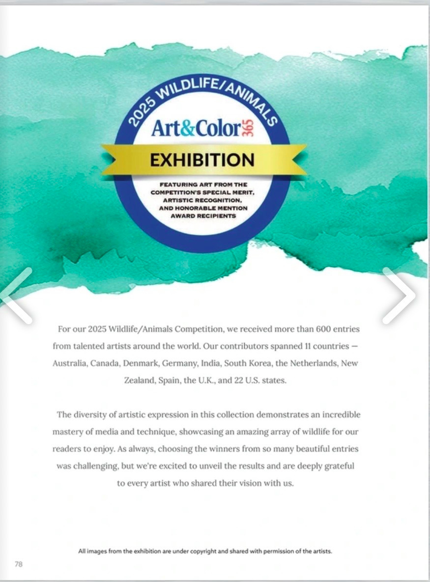 I’m thrilled to share that my artwork “Rocky” the Raccoon has received an Honorable Mention in the 2025 Wildlife/Animal Competition with Art and Color 365 Magazine!